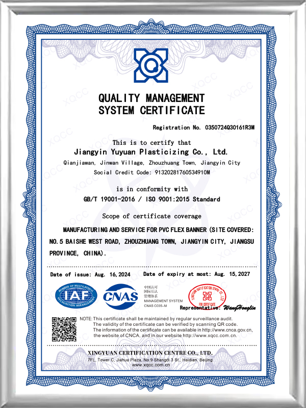 Depuis des décennies, YUYUAN est à l’avant-garde de l’industrie du plastique. Nos capacités de fabrication avancées comprennent trois lignes de calandrage de haute précision de Taiwan, huit laminateurs de bannières de 5,2 mètres et plus de dix machines automatiques de tricotage de chaîne biaxiale de 6,8 mètres de l'Allemand Karl Mayer, complétées par cinq unités de chaîne. Ce système de production intégré nous permet d’offrir l’excellence à chaque étape.